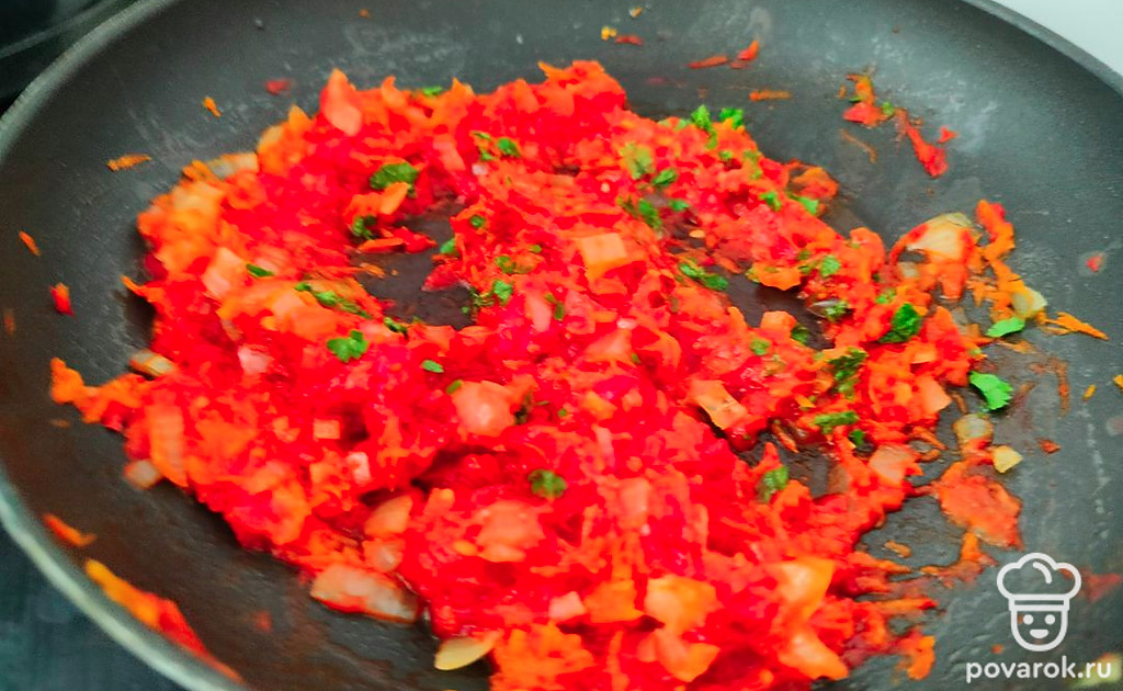 В зажарку добавьте тертый помидор, томатную пасту и измельченную зелень.