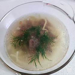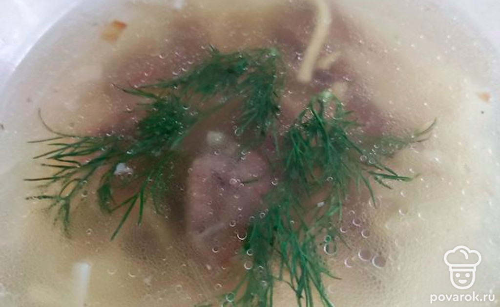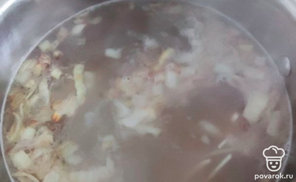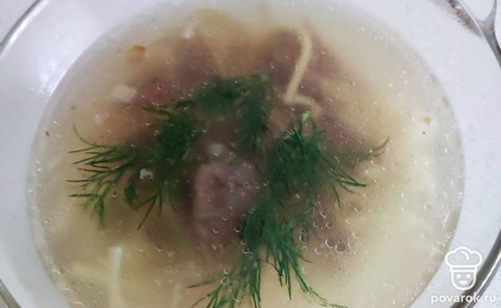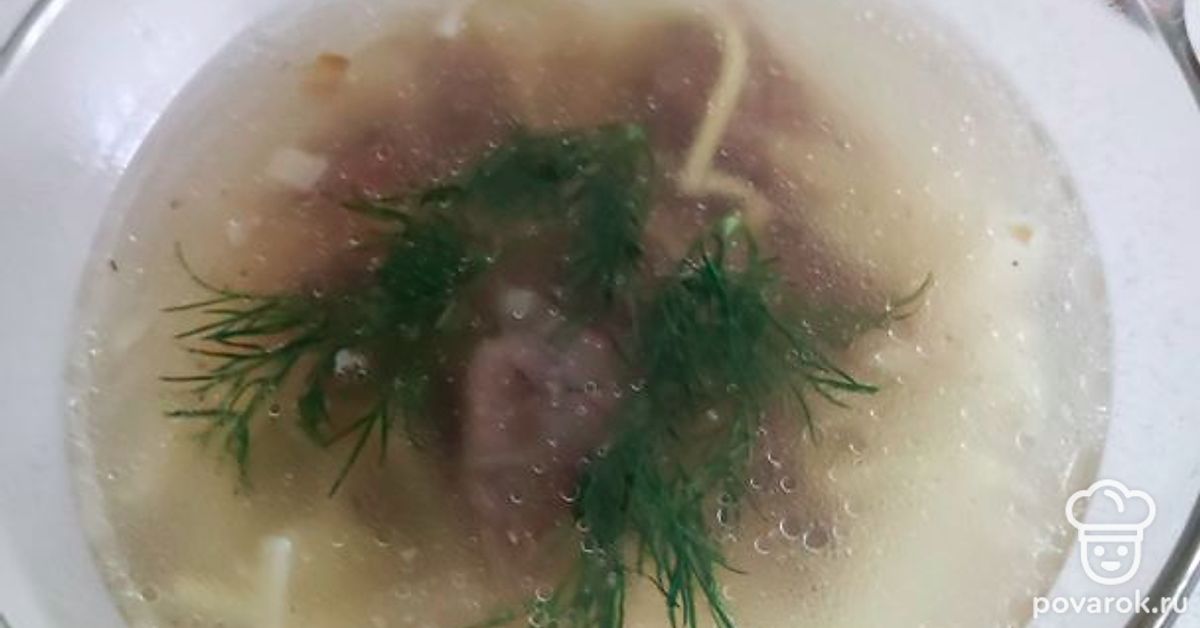 Когда мясо сварится, процедить бульон и вскипятить. После закипания добавить обжаренный лук, лапшу. Мясо освободить от кости, нарезать и отправить в суп. Если нужно — досолить. Варить до готовности лапши.