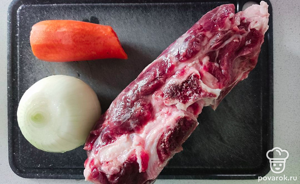 Подготовить ингредиенты. Мясо помыть, лук и морковь почистить.