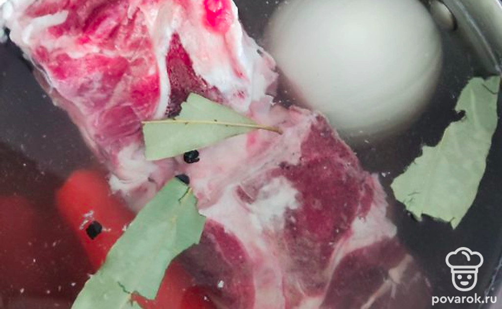 Погрузить все ингредиенты в кастрюлю с водой. Добавить соль, лавровый лист и черный перец горшоком. Варить до готовности мяса 1,5-2 часа.