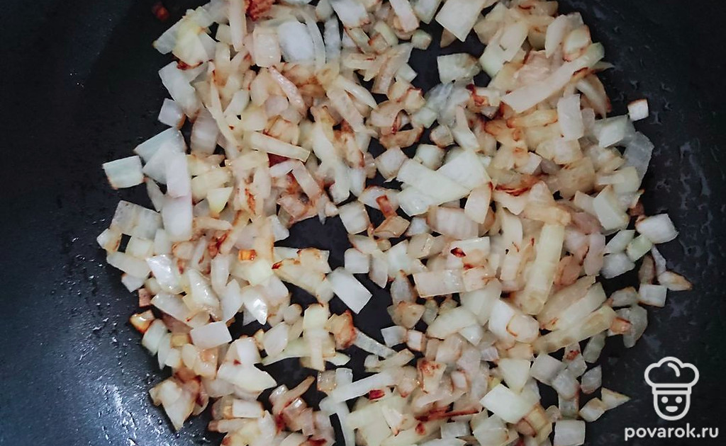 Головку репчатого лука нарезать кубиком и поджарить на подсолнечном масле до золотистого цвета.
