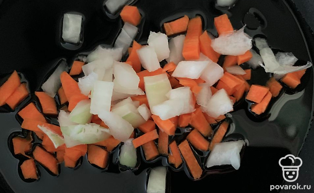 Лук и морковку нарезать и обжарить на сковородке до прозрачности лука.
