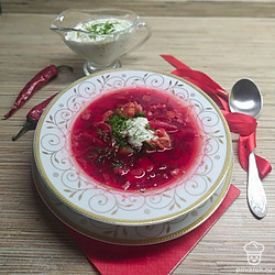 Борщ можно подать со сметаной, майонезом или соусом. Для соуса сметану смешайте с зернистой горчицей, добавьте мелко нарезанную зелень. Все перемешайте, подайте в соуснике.
