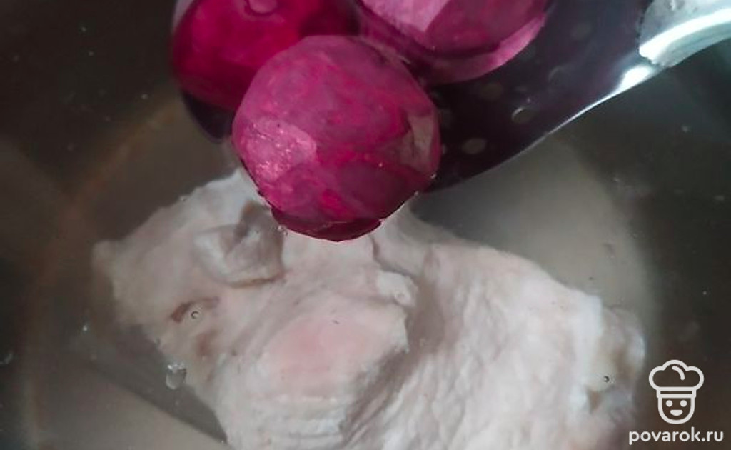 Во второй бульон положите очищенную свеклу. Она будет вариться с мясом.