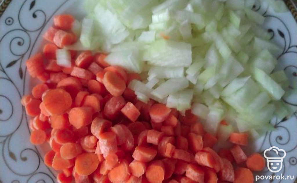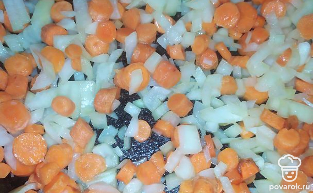 Обжарьте лук и морковь на растительном масле на сковороде.