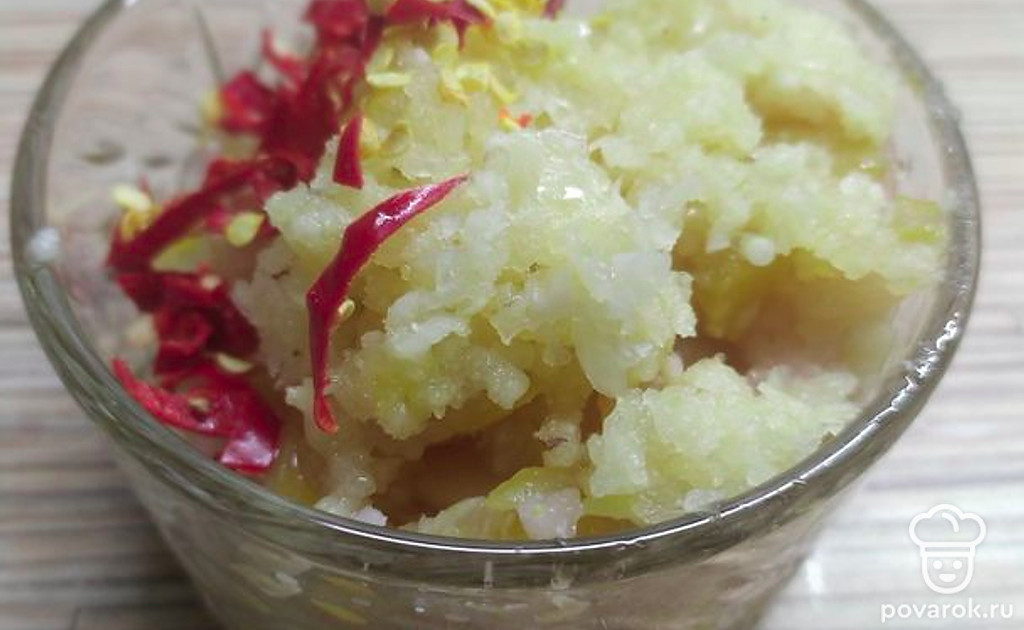 Снимите сало с вареной свинины, разомните его вилкой с раздавленным через чеснокодавилку чесноком и мелко нарезанным жгучим перцем. Не бойтесь добавить в борщ целую головку чеснока, это будет вкусно.