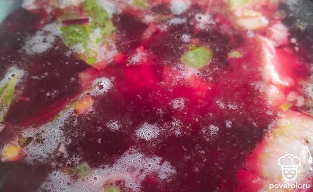 Овощи по очереди отправляйте в бульон. Сначала картофель (ждем закипания), затем капусту (ждем, когда закипит). Закипело, кладите зажарку. Затем отправьте в бульон свеклу и сразу же добавьте 1-2 столовые ложки лимонного сока или яблочного уксуса. Так ваш борщ будет яркого свекольного цвета. Затем добавьте сало с чесноком. Не забудьте добавить пару листов лаврушки.