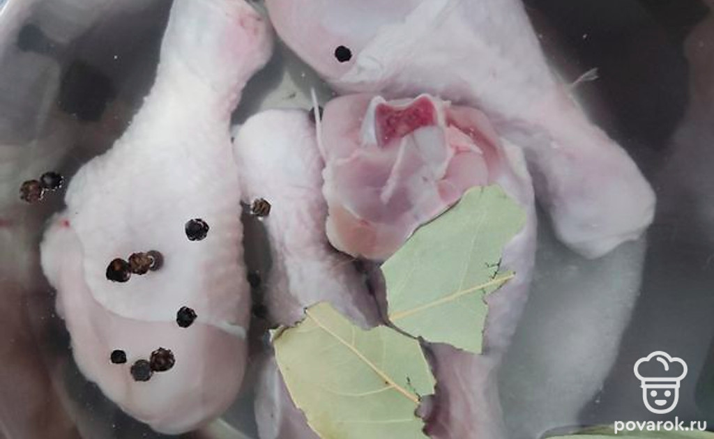 В большой кастрюле отварить куриные голени, добавив соль, перец горошком и лавровый лист.
