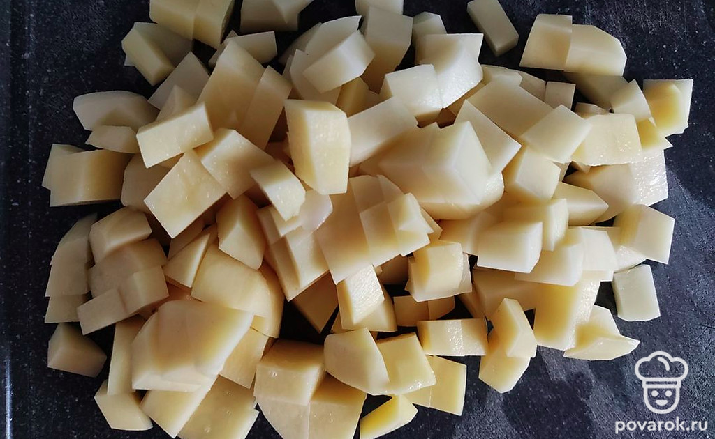 Картошку почистить и нарезать кубиком. Поместить в бульон.