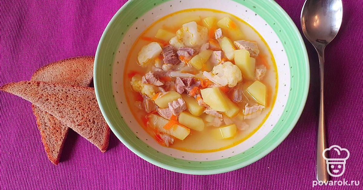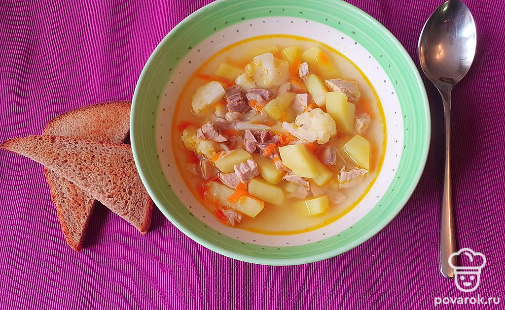 В бульон выложить лук с морковью, мелко нарезанный чеснок и цветную капусту, разобранную на соцветия. Варить до готовности.