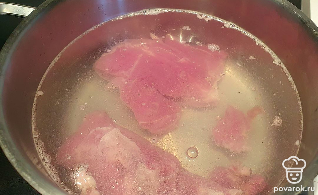Налить воду в кастрюлю и положить мясо. Поставить на плиту и варить.