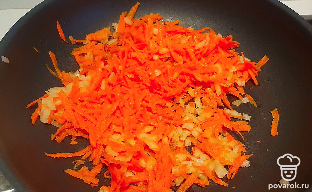 В это время натереть морковь, нарезать лук и пассеровать на растительном масле.
