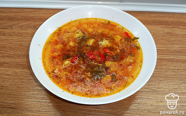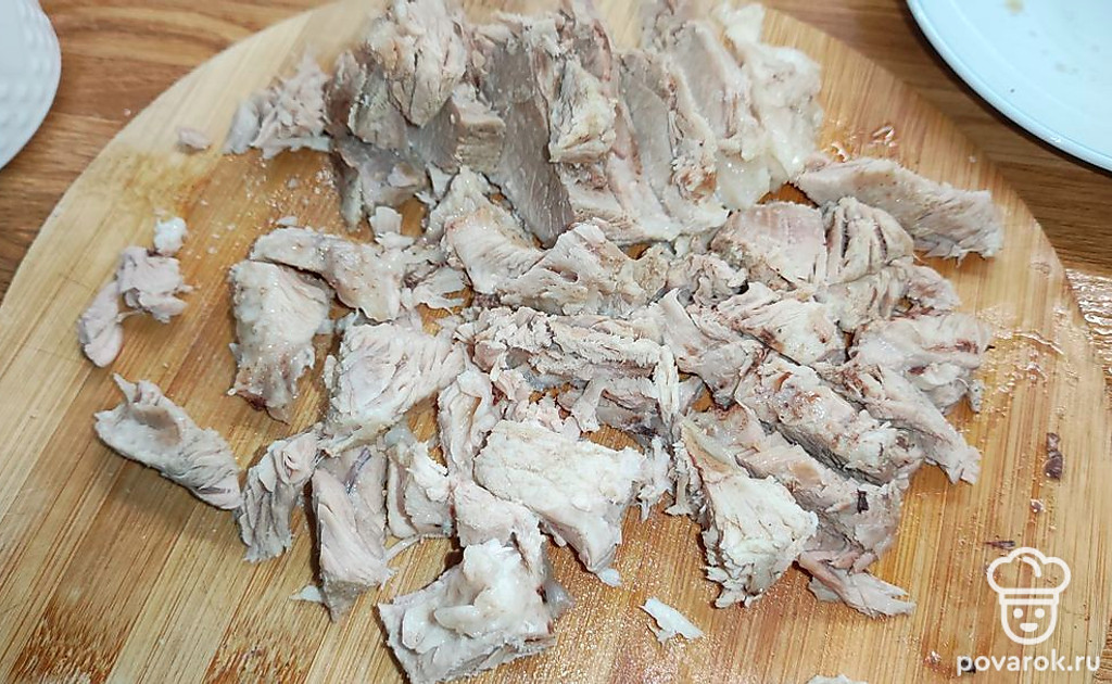 Мясо снять с кости, нарезать на кусочки и вернуть в бульон. Добавить соль по вкусу.