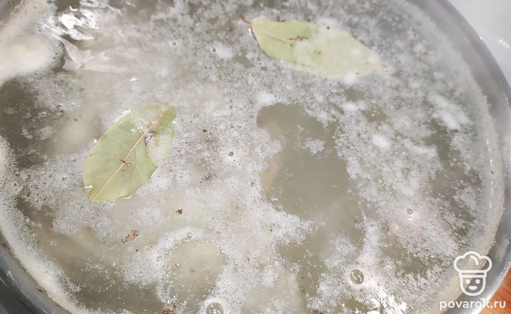 Отварить бульон в течение 1,5 часов. Добавить лавровый лист и душистый перец горошком.
