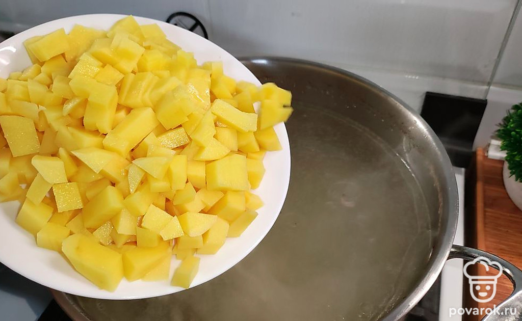 Отварное мясо на кости убрать из бульона. Картофель очистить и помыть, нарезать кубиком и добавить в готовый бульон. Отварить картофель в течение 10 минут.