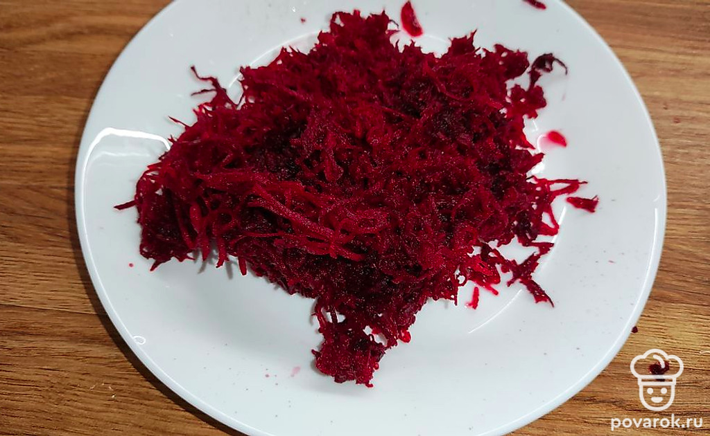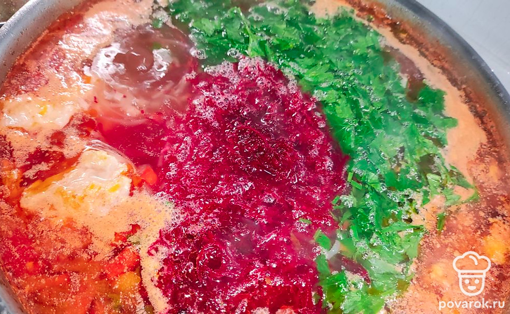 Приправить измельченной зеленью и отправить в бульон тертую свелку. При добавлении свеклы щи станут яркого цвета, но через 10 минут цвет щей становится ближе к томатному. После выложить тертый чеснок и выключить газ.