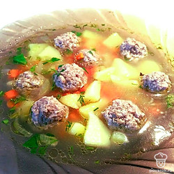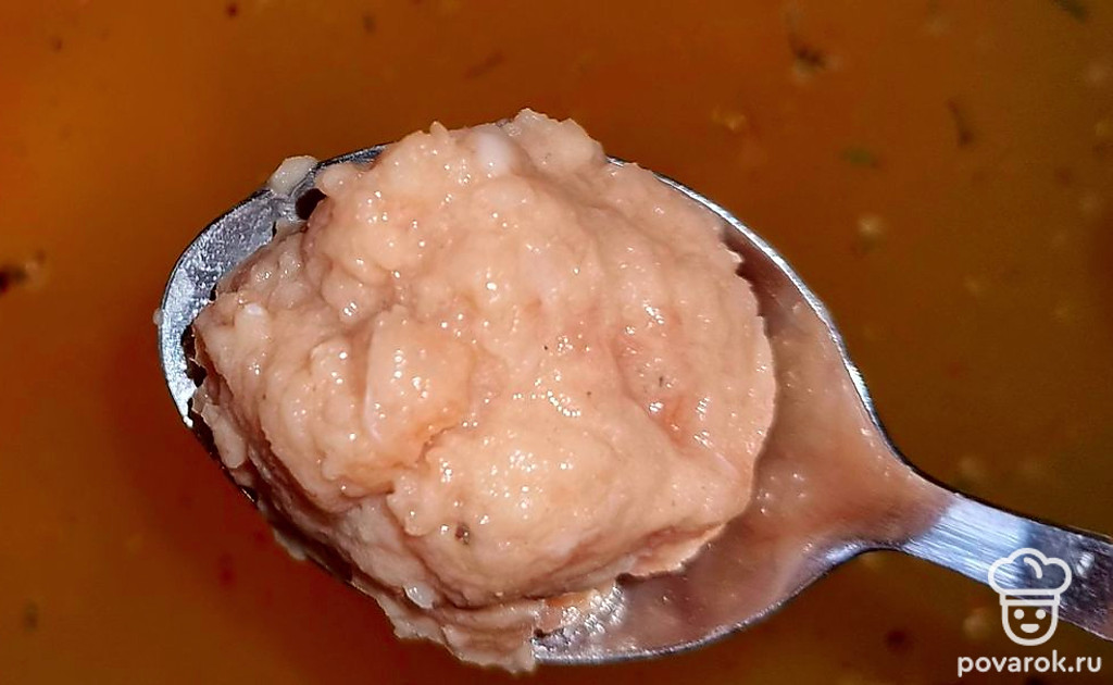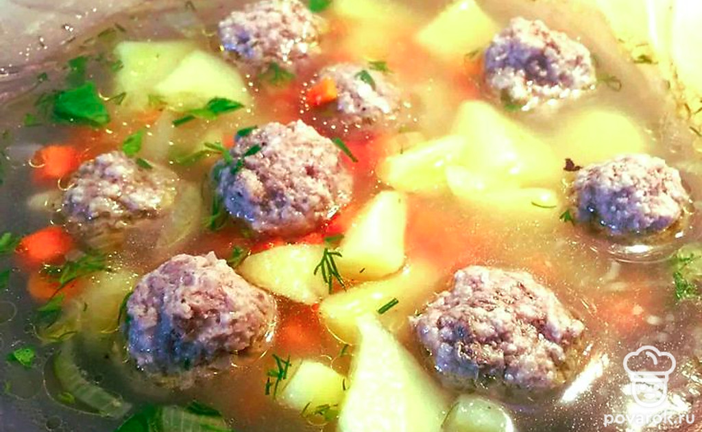 Из фарша, яйца и измельченного лука приготовить фрикадельки. Аккуратно ложкой выложить фрикадельки в воду, не перемешивать. Готовить в режиме супа 1 час.
