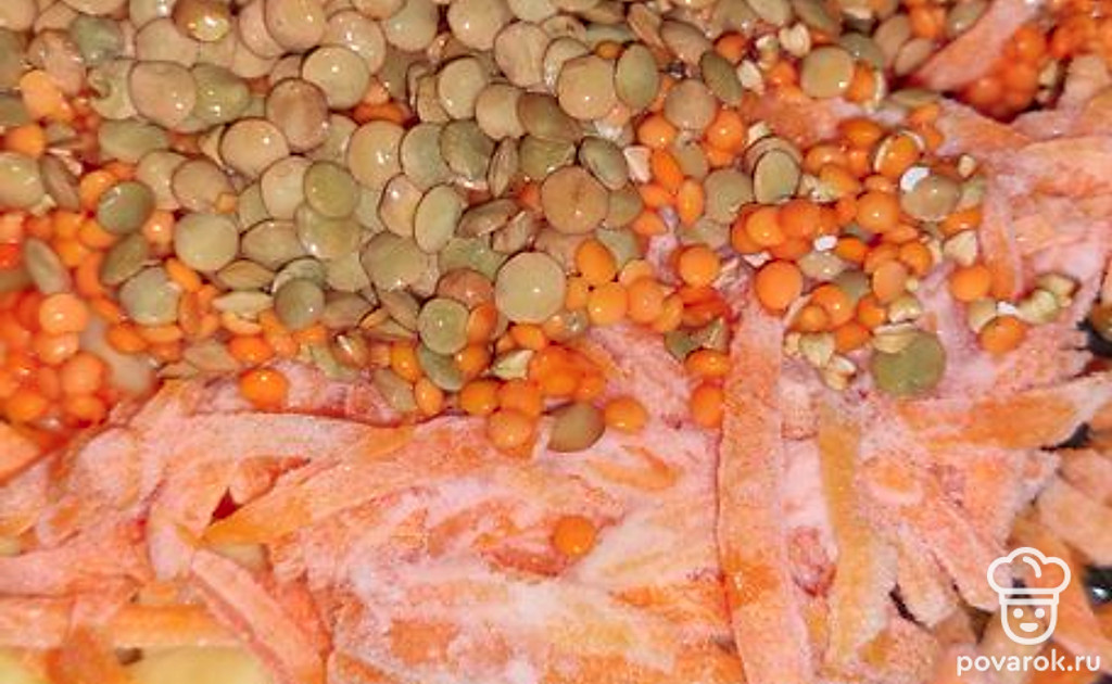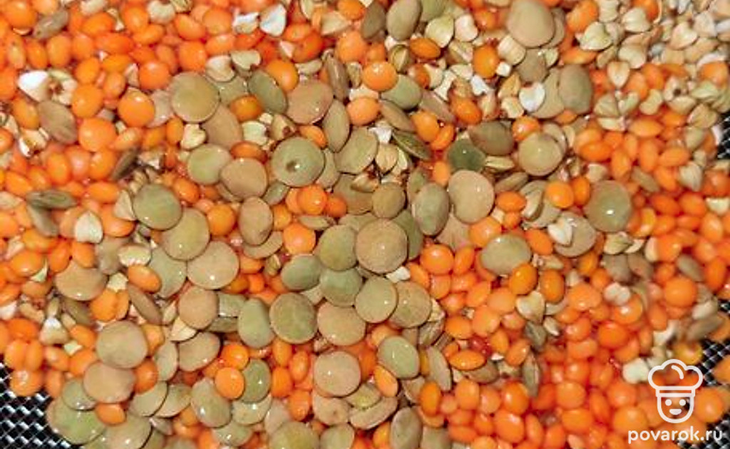 Зеленую гречку, красную и зеленую чечевицу промыть и добавить к картофелю.