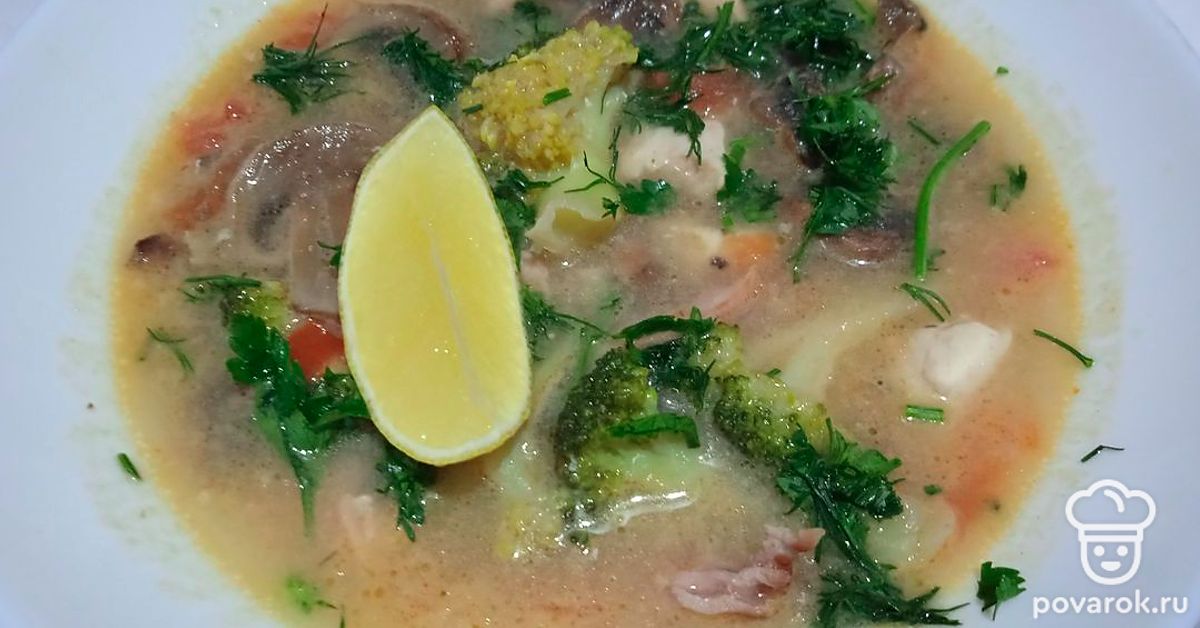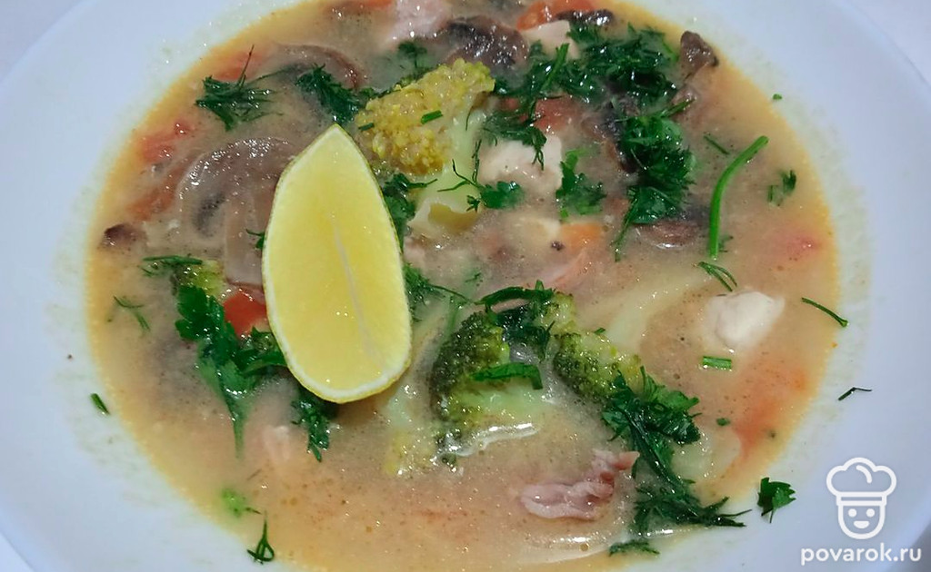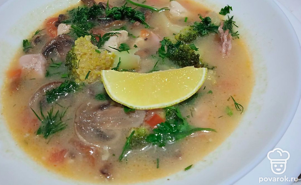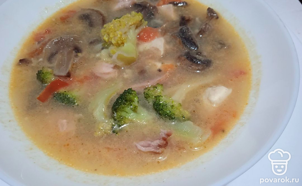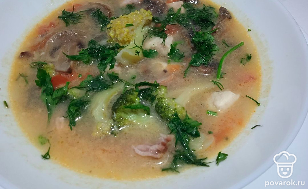 Тушите еще 5 минут. Добавьте тушеные овощи и куриную грудку в бульон.