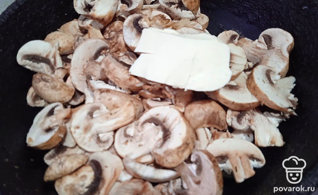Шампиньоны нарежьте. Выложите на сковороду, добавьте сливочное масло.