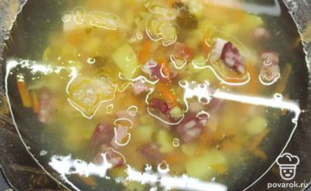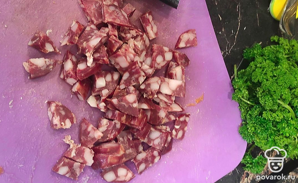Приготовить копченую колбасу, мелко нарезать и добавить в суп.