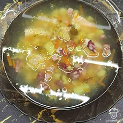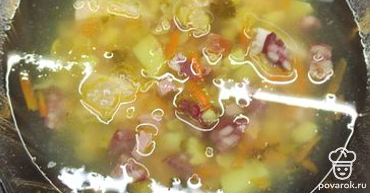 Отварить бульон из мяса в течение 1 часа, снимая пенку. Добавить горох, лавровый лист и специи по вкусу.