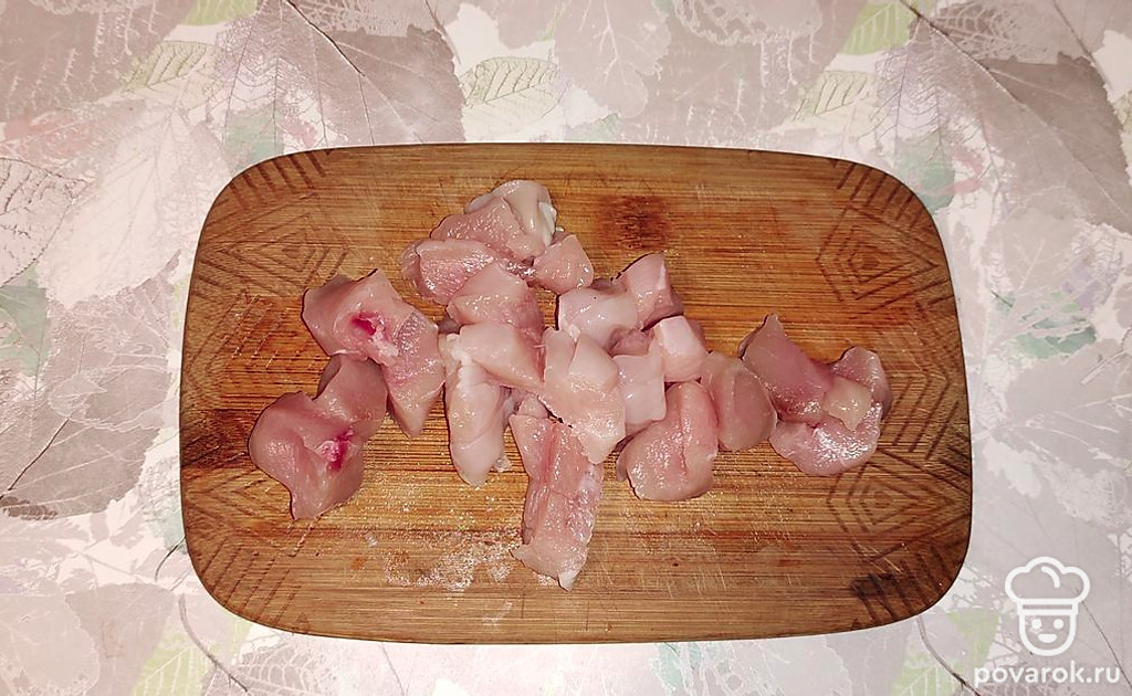 Нарежьте кубиком куриное филе и варите в овощном бульоне в течение 5-7 минут. Если образовалась пенка, снимите ее.