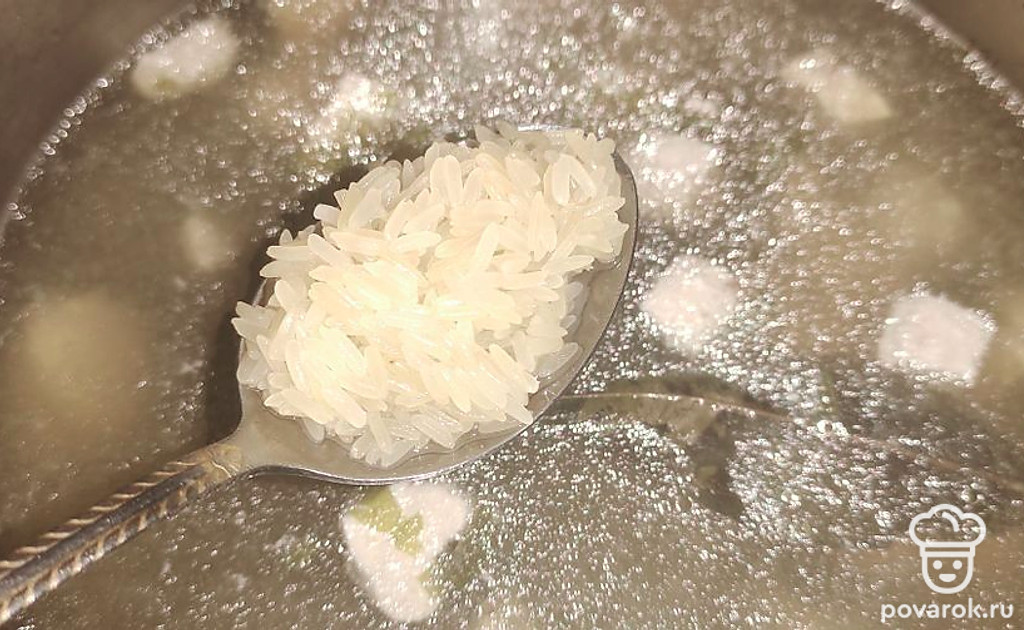 Добавьте в кастрюлю промытую рисовую крупу и лавровый лист. Варите суп на среднем огне.