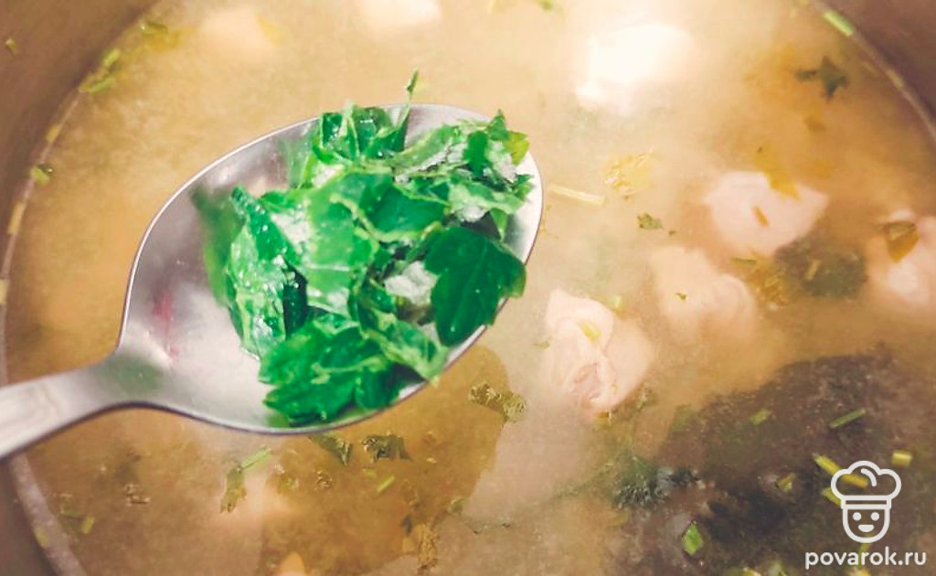 Когда рис будет готов, выключите огонь и добавьте в суп свежую или замороженную петрушку. Можно использовать другие виды зелени. Приятного аппетита!