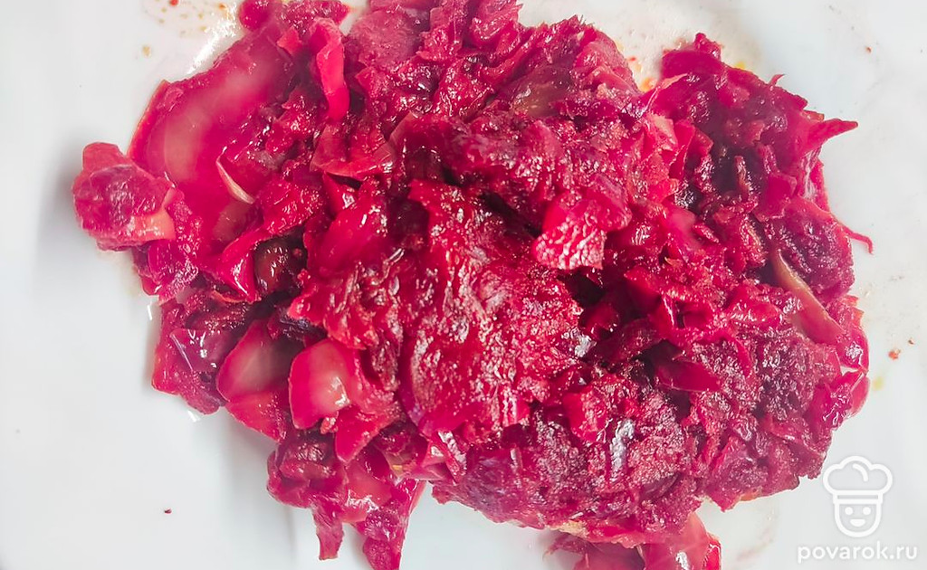 Подготовить зажарку. Морковь, лук, капусту и свеклу натереть на крупной терке, обжарить до полуготовности на подсолнечном масле. Затем добавить томатную пасту и обжарить еще 1 минуту.
