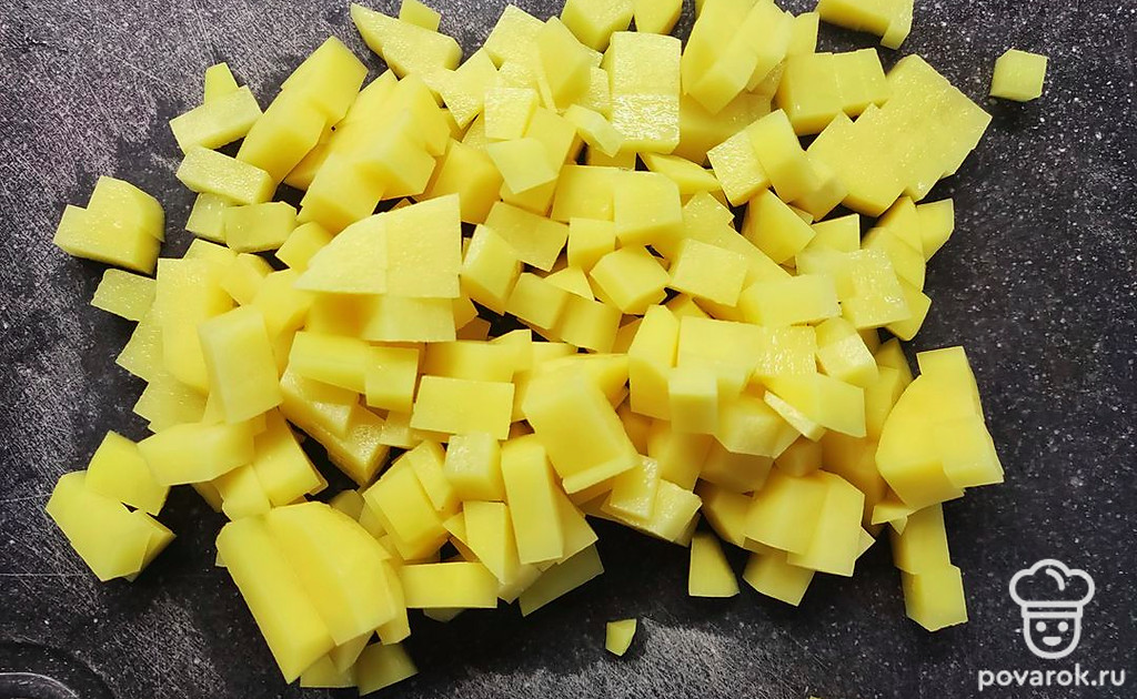Картошку почистить и нарезать кубиком. Отправить в бульон. Поставить кастрюлю на огонь и подождать, когда вода закипит. Затем добавить зажарку.