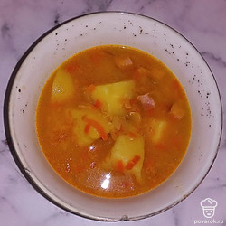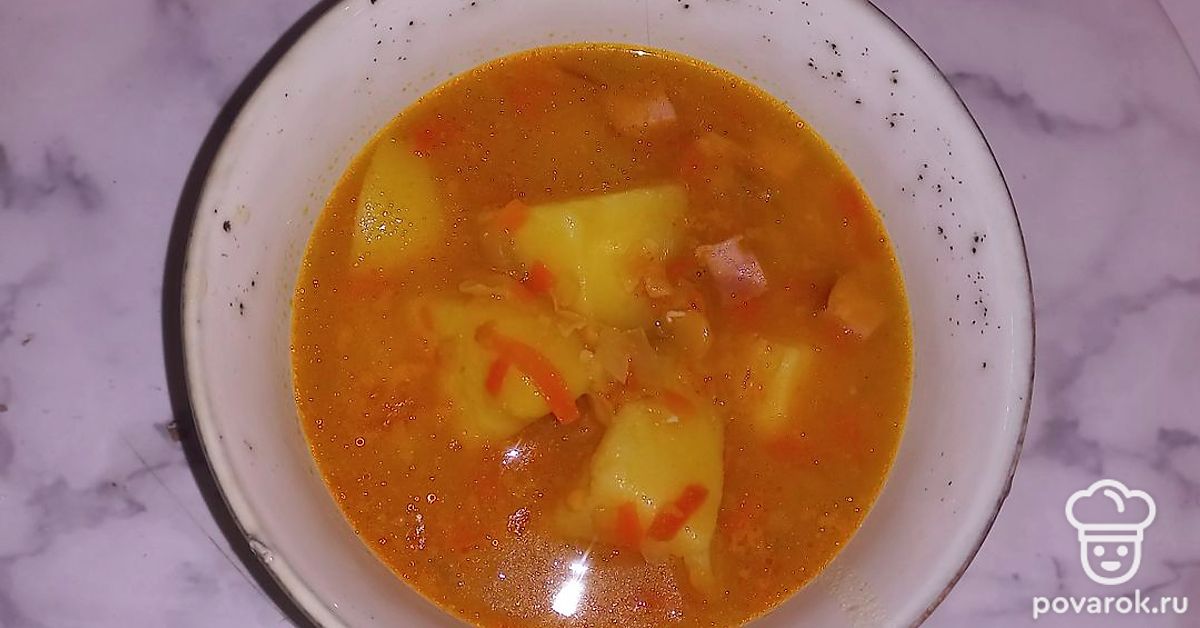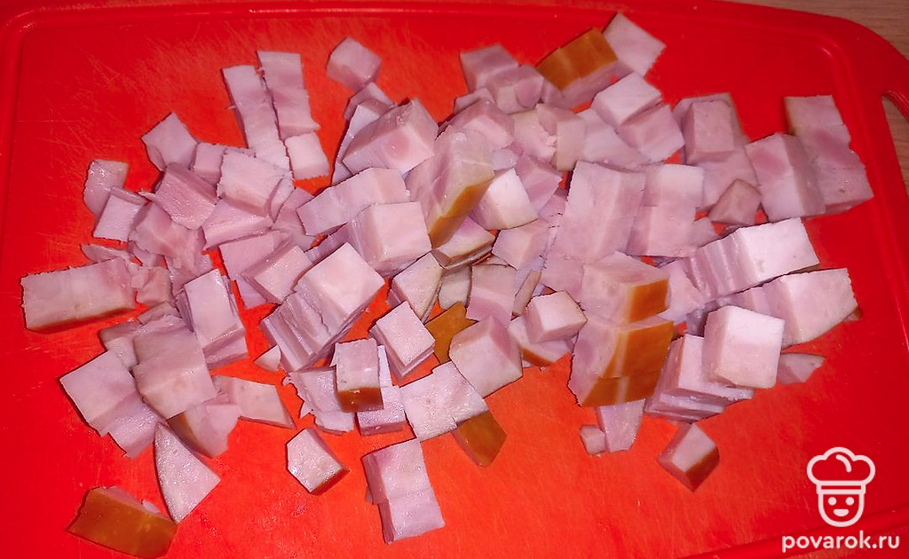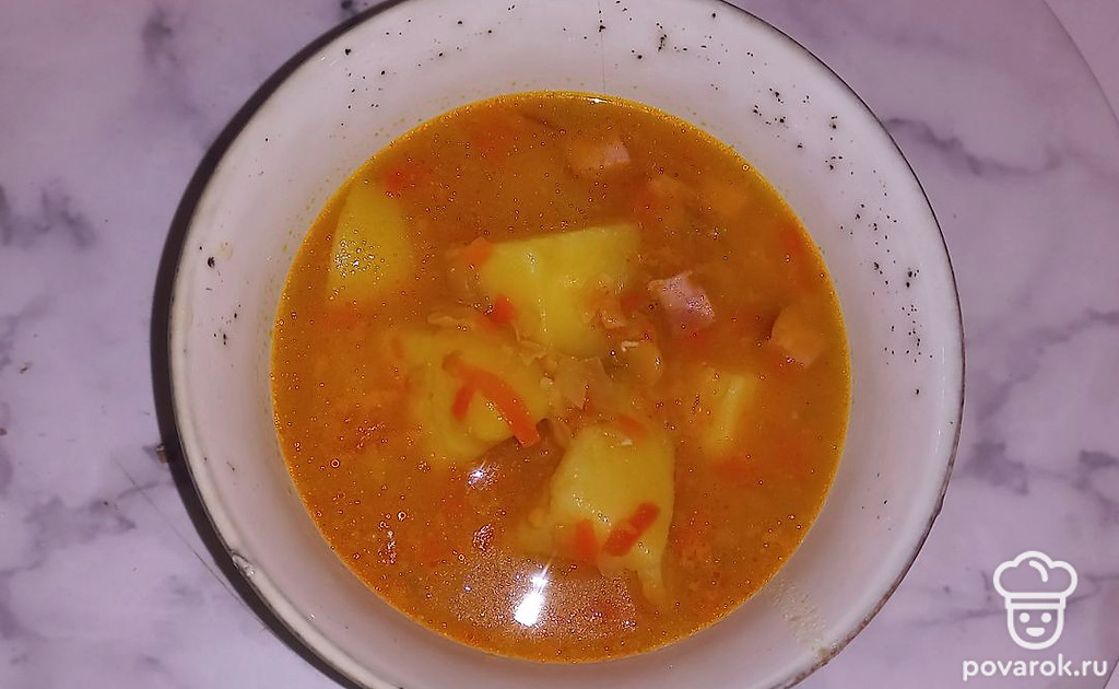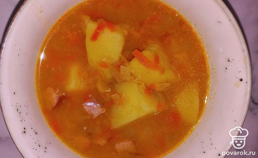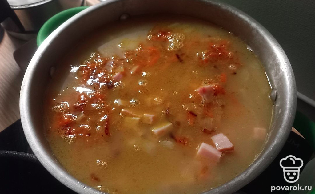 Ветчину добавляем за 20 минут до готовности. Сразу добавляем и зажарку.