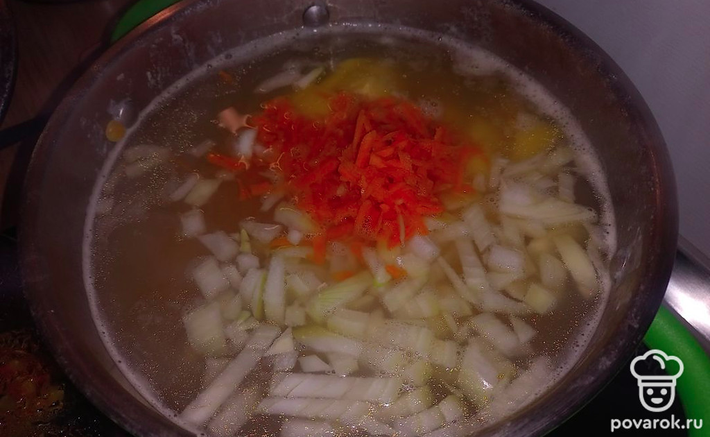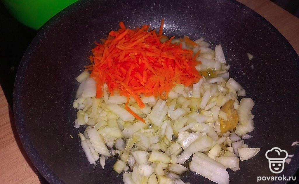 В это время обжариваем мелко нарезанный лук и тертую морковь на топленом масле до золотистого цвета.