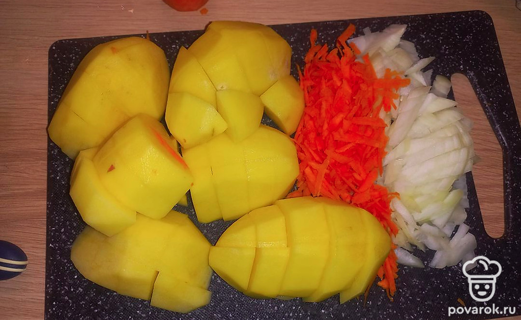 Часть морковки и лука оставляем, нарезаем картошку крупными кубиками.
