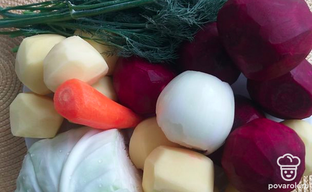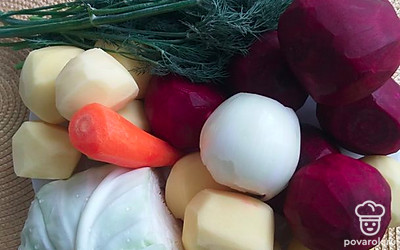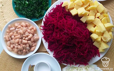 Натрите морковь и свеклу, нарежьте картошку, лук, петрушку и укроп, нашинкуйте капусту. Возьмите фасоль (консервированную), лавровый лист и соль.