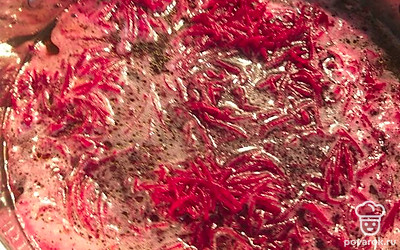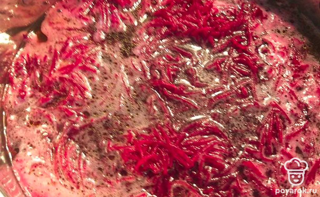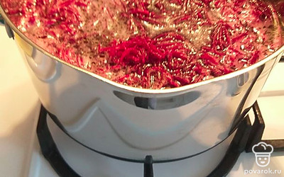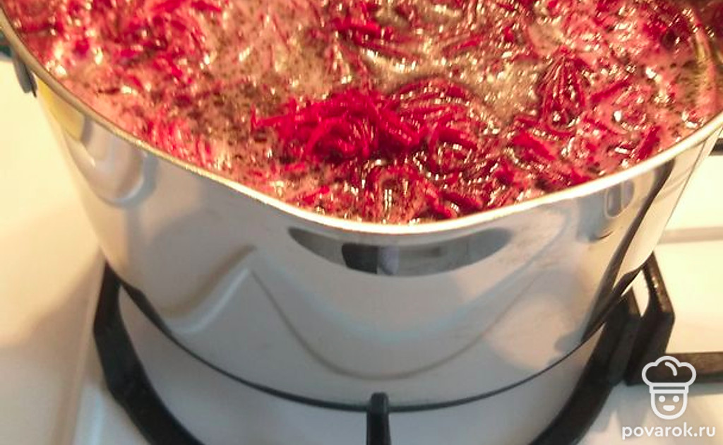 В пассерованный лук и морковку добавьте воду, свеклу, томатную пасту, лавровый лист, перец и варите 30 минут на медленном огне.