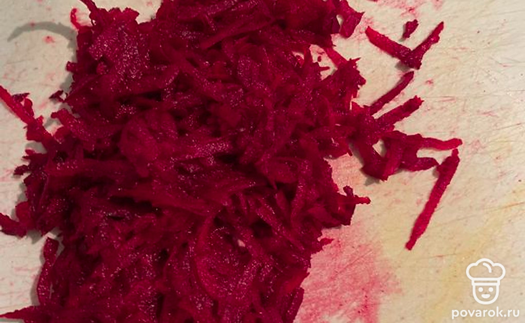 Очищенную свеклу натираем на терке. Я люблю на крупной, но можно попробовать соломкой или брусочками. Как хотите. Готовую свеклу выкладываем в тарелку, она нам понадобится чуть позже.