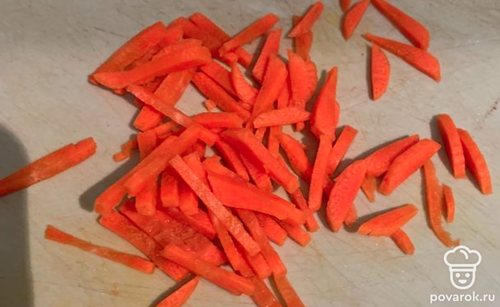 Так же поступаем и с морковью. Ее нарезаем на брусочки, но можно и вообще не добавлять. Кстати, сюда хорошо подходит лук. Режем морковь и также убираем в сторону. Пока подготавливаем овощи, наш бульон готов. Высыпаем туда картофель, пускай он варится.