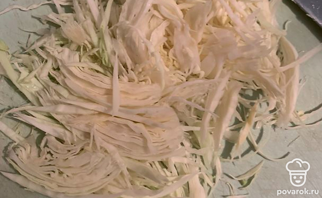 Займемся капустой. Нарезаем с помощью специального ножа, но у меня его нет, поэтому я делаю это обычным ножом. Стараемся резать максимально тонко, так она быстрее приготовится.