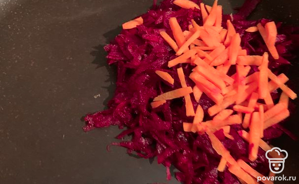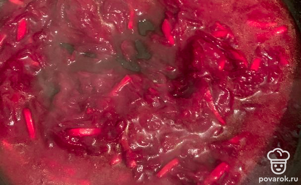 Ставим сковороду на огонь. Выкладываем свеклу и морковь, добавляем масло. Жарим минут 5-7, после чего добавляем томатную пасту и бульон. Тушим до готовности овощей.