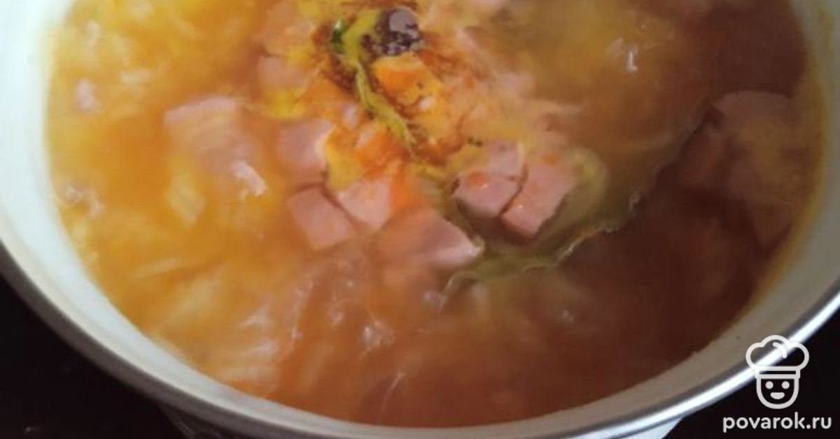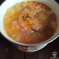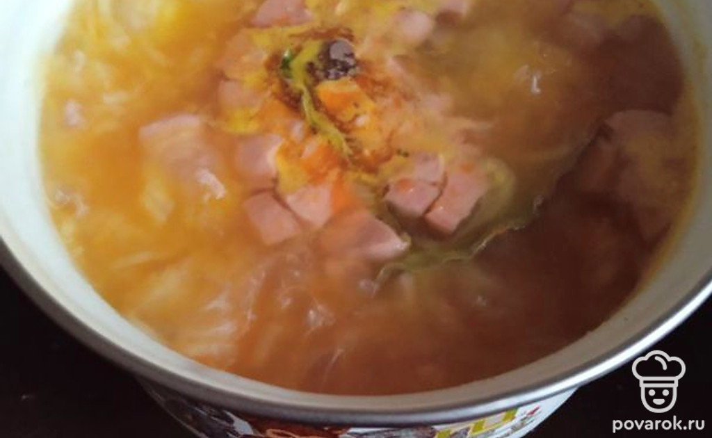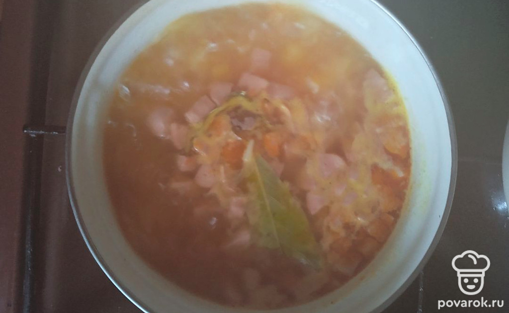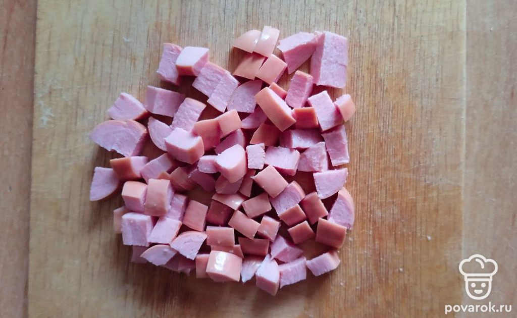 Сосиски нарезаем кубиками, добавляем в кастрюлю.