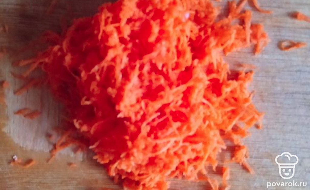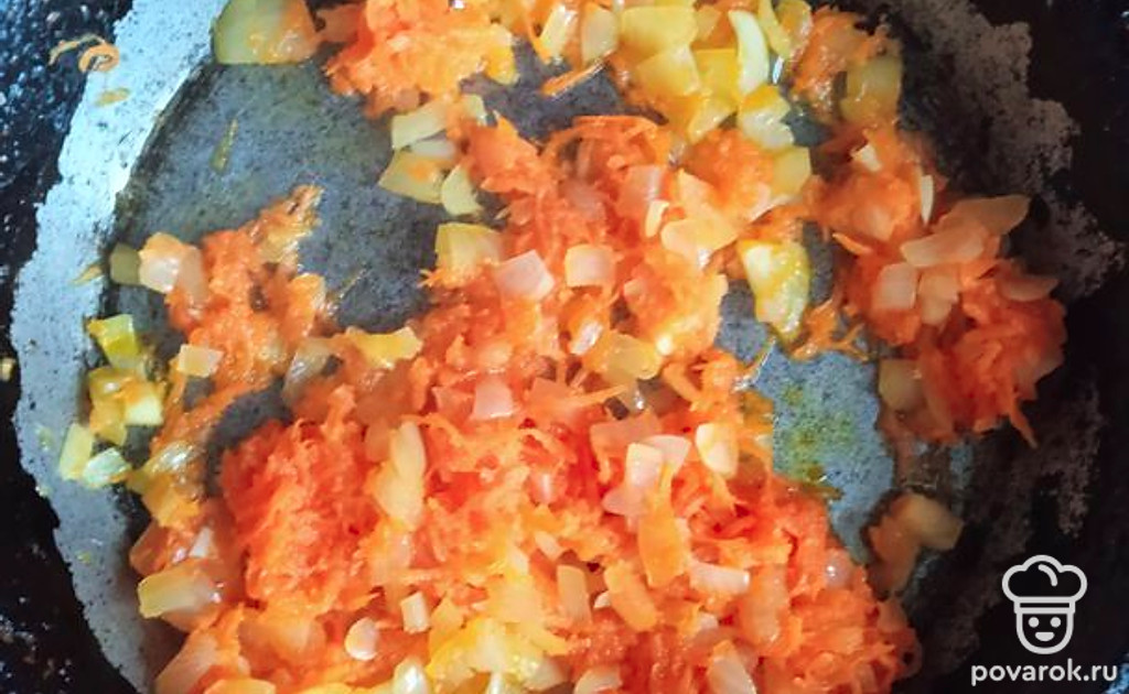 Обжариваем лук и морковь на сковородке. Затем отправляем в кастрюлю.