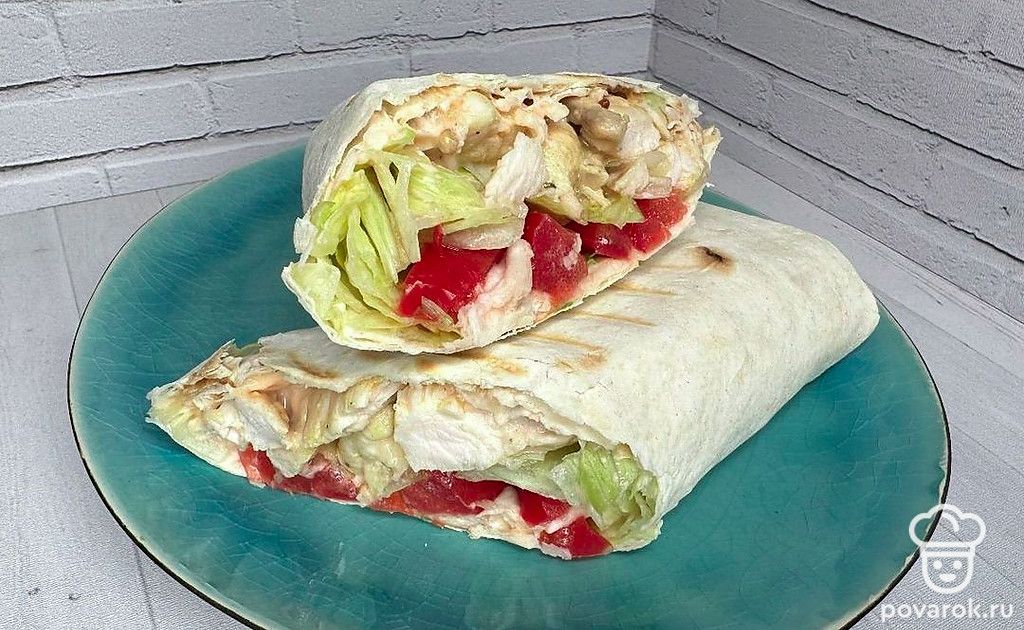 Шаверма готова. Для удобства можете разрезать пополам. Можете есть так, как вам больше нравится. Приятного аппетита!