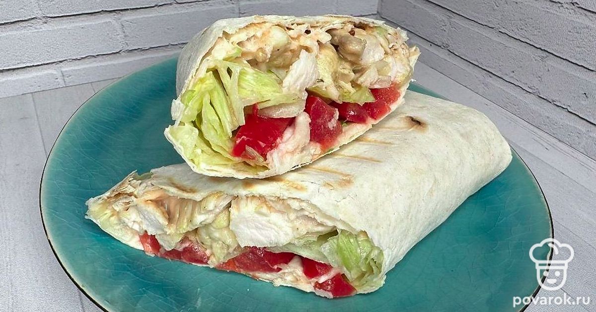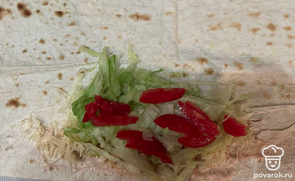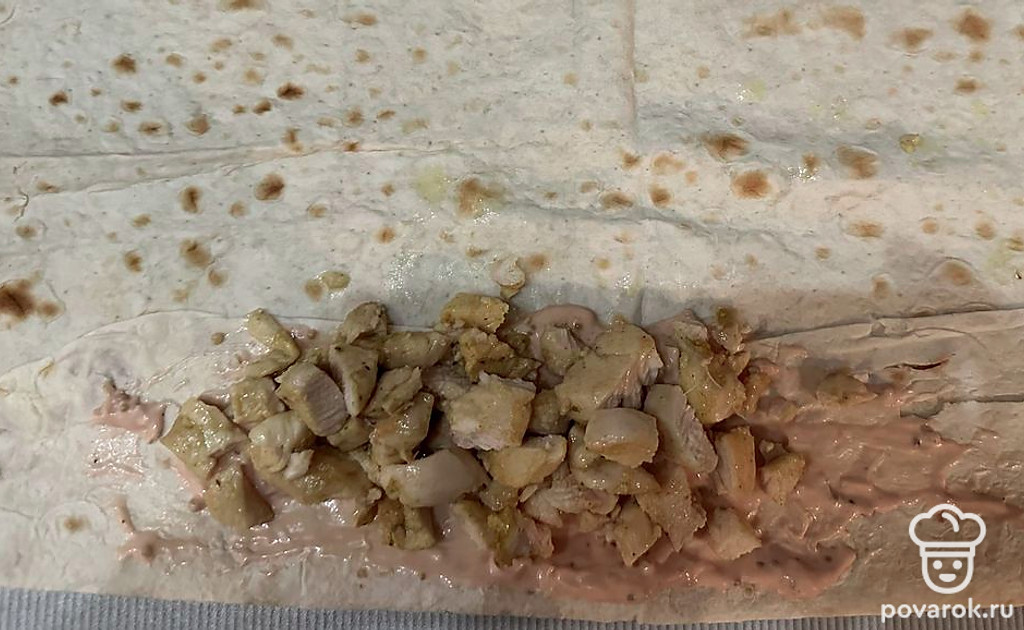 Соберите шаверму. Край половины лаваша подверните и смажьте соусом. Сверху выложите обжаренное филе.