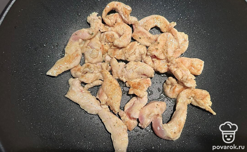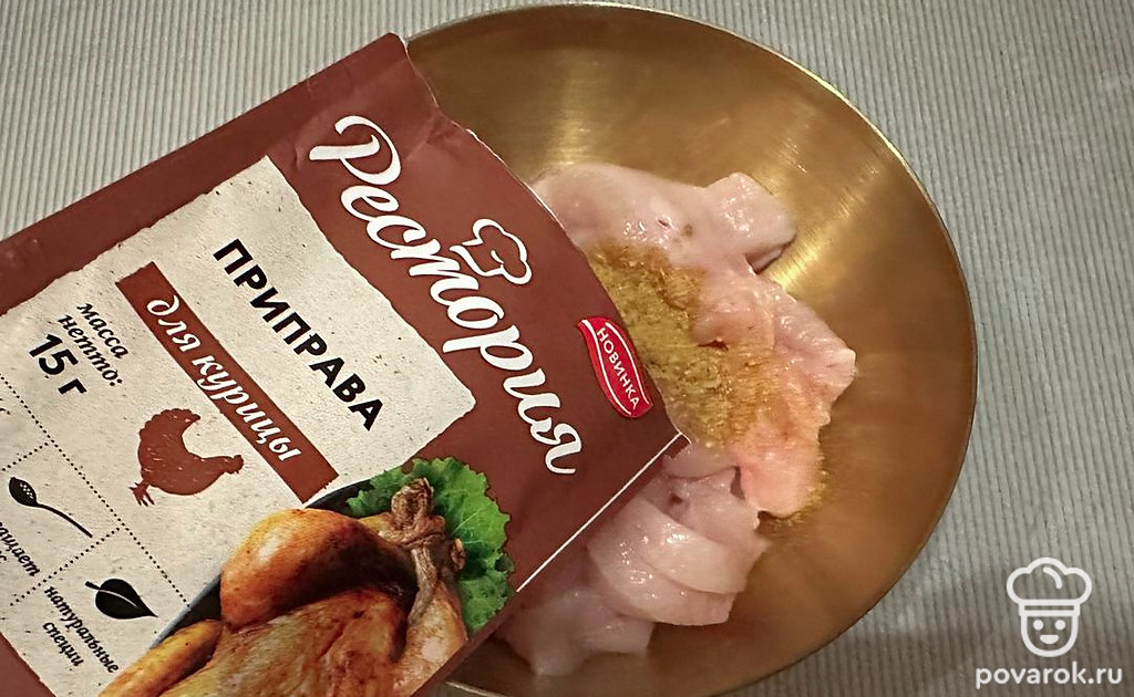 Куриное филе помойте. Нарежьте небольшими кусочками. Добавьте специи для курицы, соль и ложку растительного масла. Перемешайте и оставьте мариноваться минут 15.