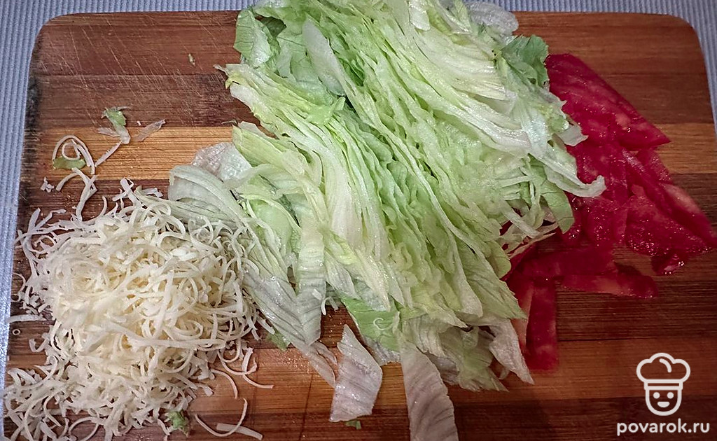 Помидор помойте и нарежьте соломкой. Салат айсберг измельчите, сыр натрите на мелкой терке.