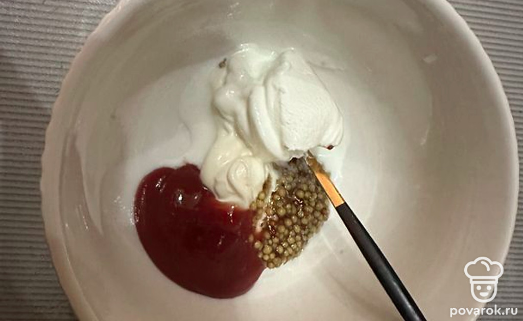 Для соуса смешайте горчицу, майонез, кетчуп и сметану.