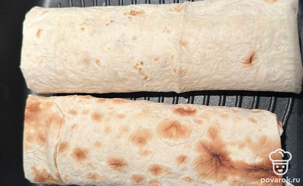 Заверните шаверму. Обжарьте на сковороде гриль или обычной сковороде, до румяной корочки.