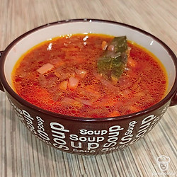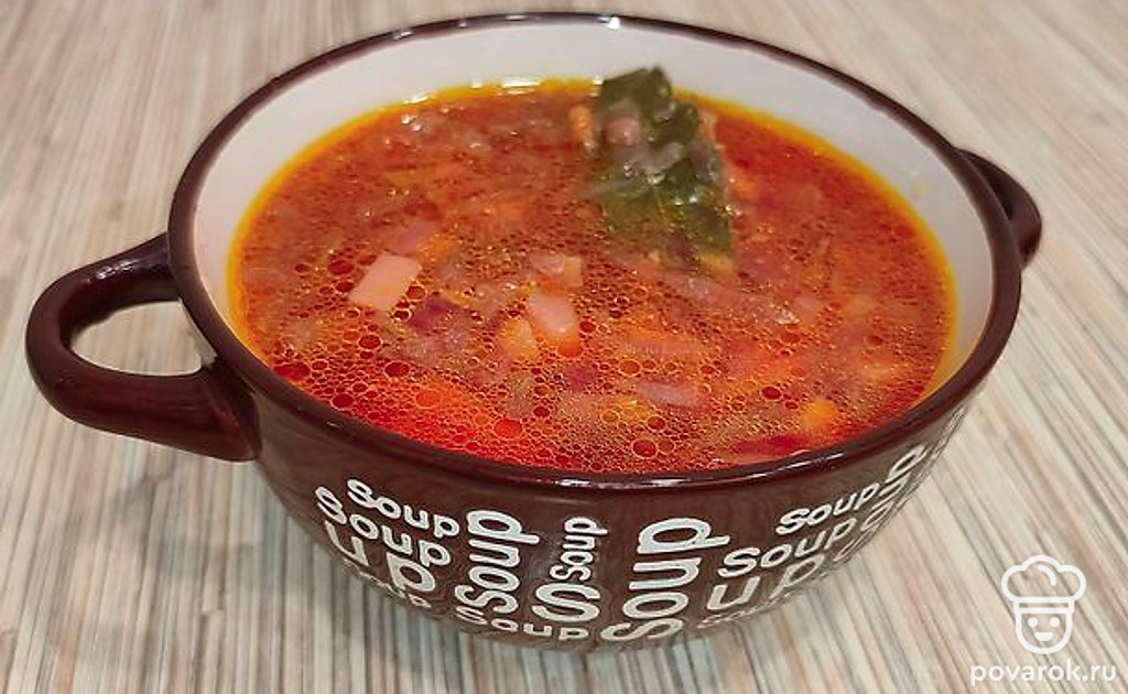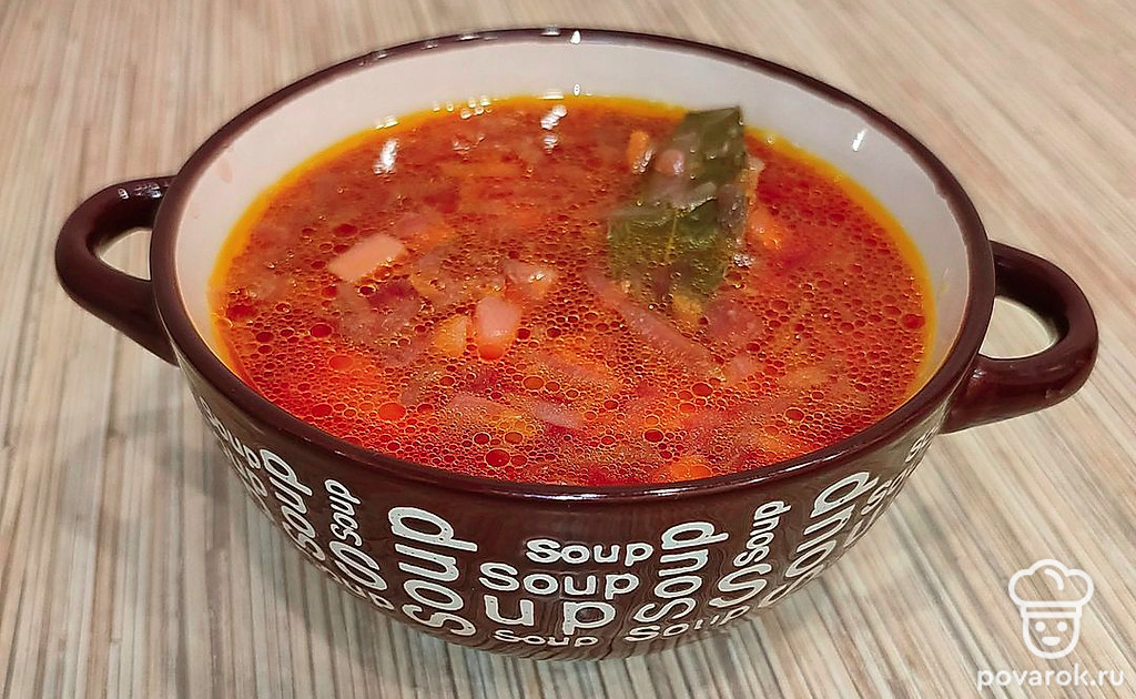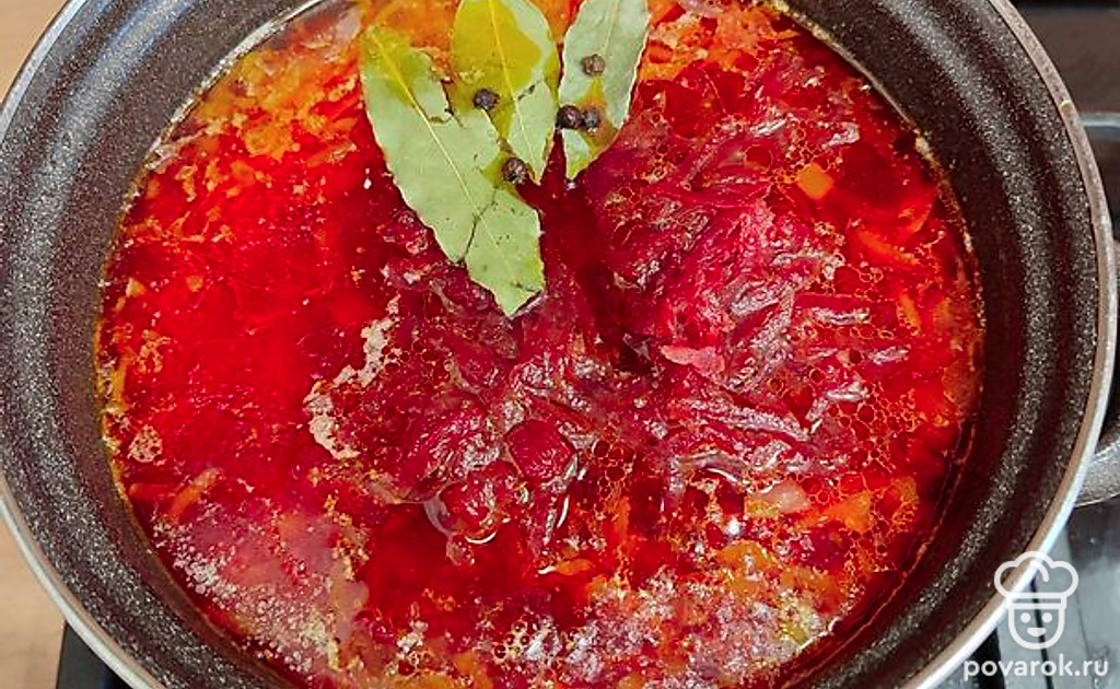 Свеклу отправить в кастрюлю к супу. Приправить лавровым листом и горошком черного перца.