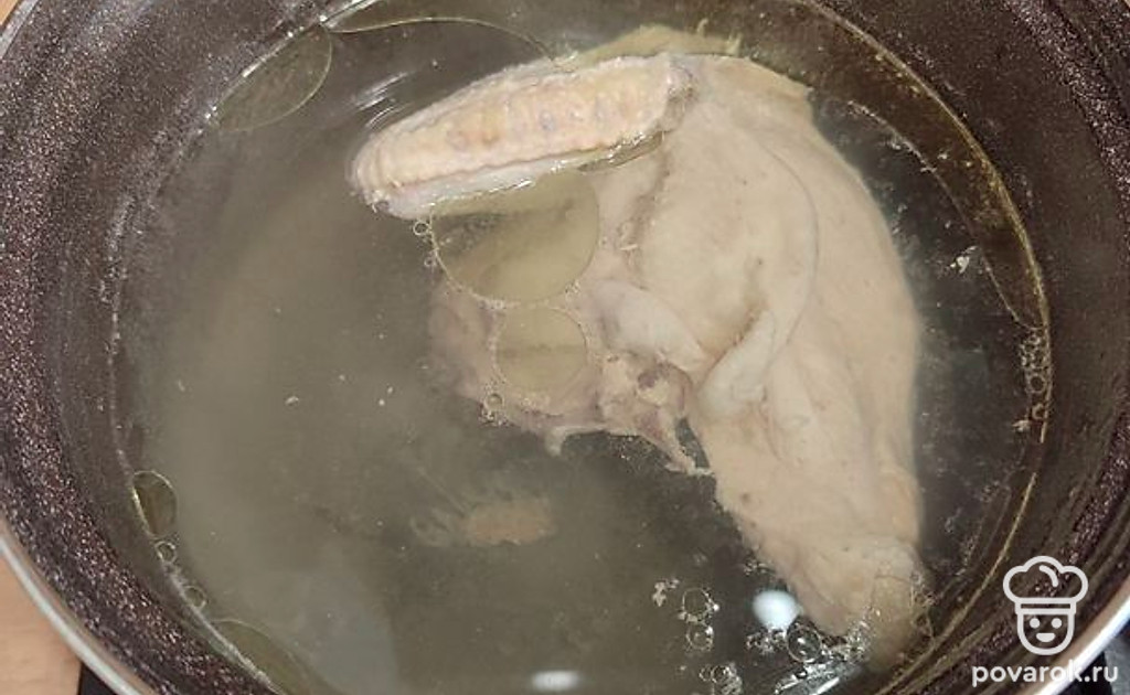 Приготовить куриный бульон. Залить куриное мясо чистой фильтрованной водой объемом 3 литра. После закипания снять пену, уменьшить огонь и готовить в течение 1 часа под закрытой крышкой. Добавить 1 столовую ложку соли.